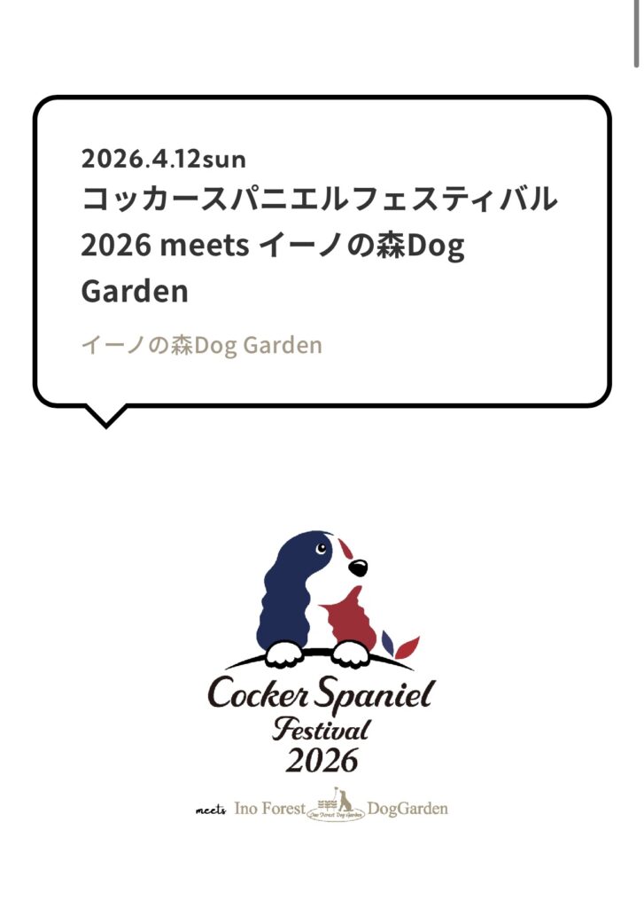 2026年4月12日(日)に東京のイーノの森Dog Gardenで開催されます、「コッカーフェスティバル2026」に無料しつけ相談での出店と、「水族館のトレーニングをイヌに応用する~理解させるのではなく、成功体験を積み重ねて教える方法」という実践セミナーを開催いたします。